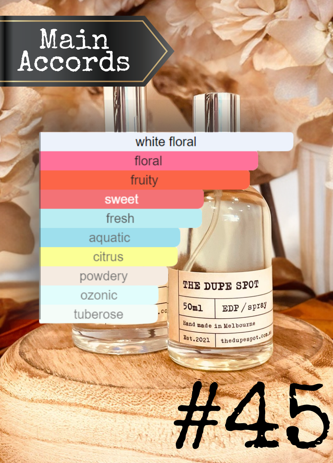 PLEASE NOTE: #45 by THE DUPE SPOT AU is not associated with J’ADORE by DIOR. The use of other brands' trademarks is solely to help consumers identify smell. We do not make counterfeit versions of J’ADORE by DIOR. We make our own formulations, inspired by famous perfumes.